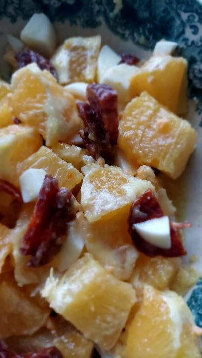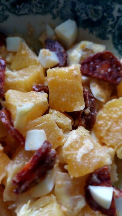 Se pelan y cortan en pedazos las naranjas y el limón y se le añaden los huevos cocidos y el chorizo también cortados. Se pica muy menudito el ajo y se echa a la ensalada, se añade sal y aceite de oliva y se remueve.